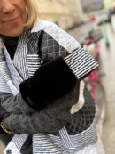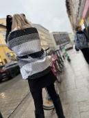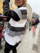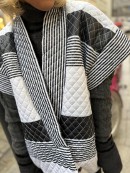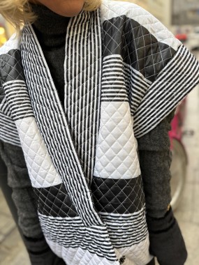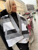 Swobodna damska kamizelka , uszyta z tkaniny pikowanej w biało-czarny geometryczny wzór.
