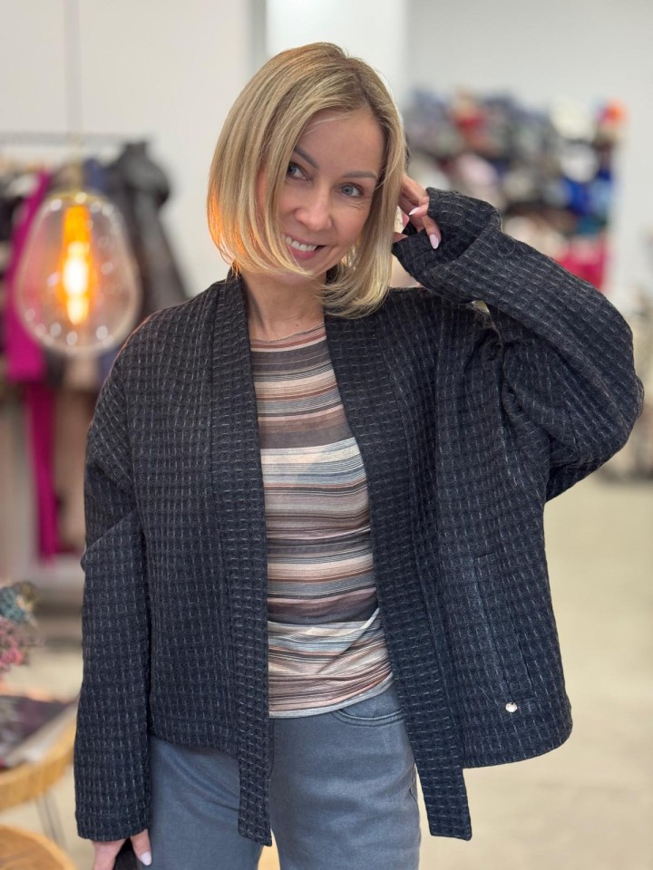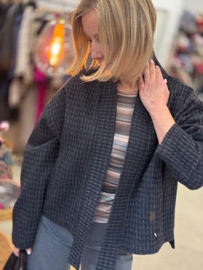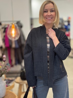 Swobodna damskie wdzianko , uszyta z wełnianej tkaniny w tłoczony wzór.