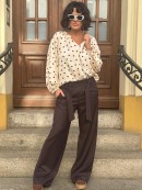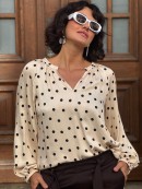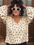 Elegancka bluzka, z wiskozy tkaninowej we wzór czarnych groszków na waniliowym tle. Świetnie wygląda zarówno do spodni typu culoty, jak i spódnic.