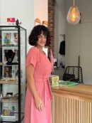 Okrągły dekolt , talia na szerokim pasie, zapięcie na zamek dopasowujące na tyle.
