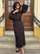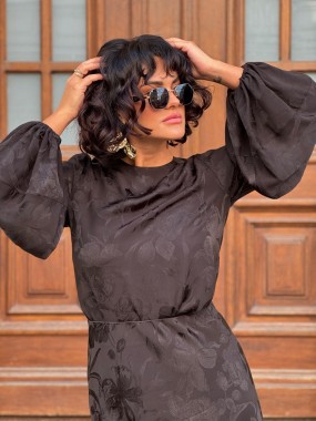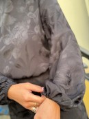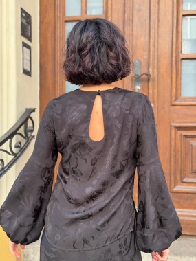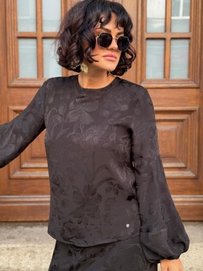 Elegancka i subtelna bluzka uszyta z lejącej tkaniny w tłoczony wzór kwiatów na czarnym tle.