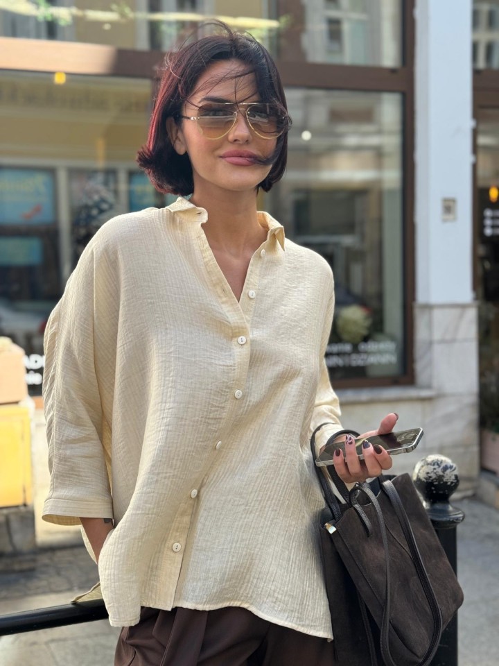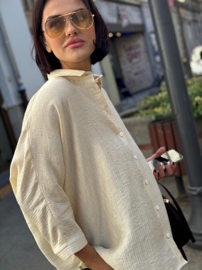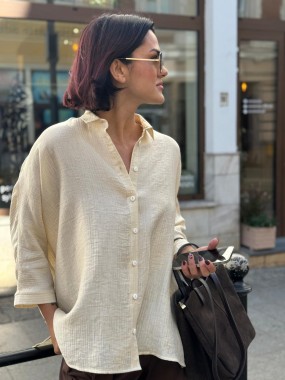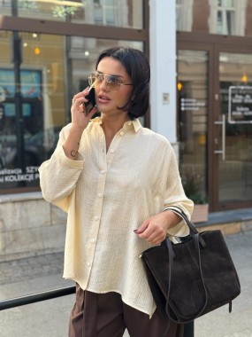 Koszula uszyta z mieszanki naturalnych tkanin w perłowym kolorze.