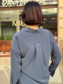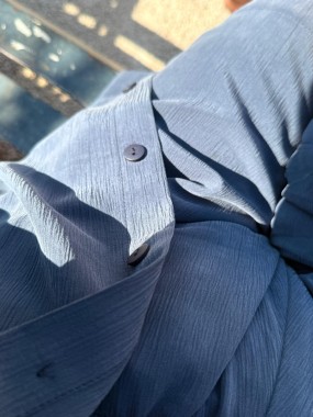 Dekolt z kołnierzykiem, długim rękawem na opuszczonym ramieniu wykończonym mankietem, zapięcie na guziki , ozdobna naszyta kieszonka.