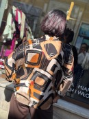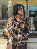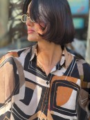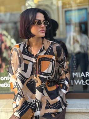 Koszula uszyta z naturalnej włoskiej wiskozy w geometryczny wzór. Przeplatają się kolory brązu, czerni, rudego, beżu.