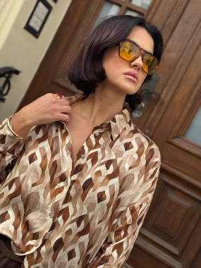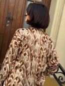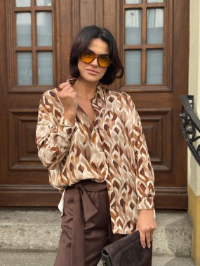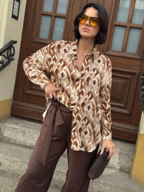 Damska koszula uszyta z włoskiej wiskozy w beżowo-brązowy geometryczny wzór .