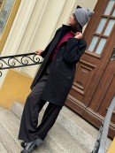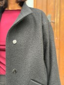 Oversizowy płaszcz uszyty na podszewce z wełny parzonej w czarnym kolorze. Kimonowy krój o zwężającym się dole wysmuklający sylwetkę. W dekolcie stójka, po bokach kieszeń cięta z jedną wypustką, zapinany na zatrzaski.
