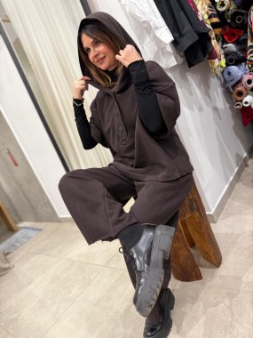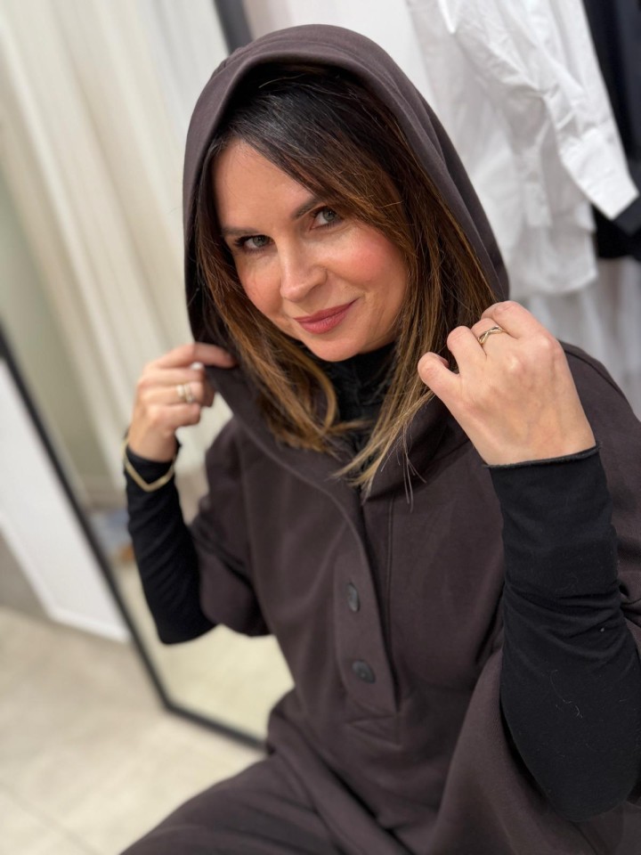 Swobodna damska bluza , uszyta z mięsistej tkaniny dzianinowej w brązowym kolorze.