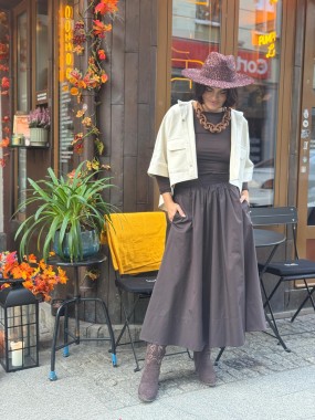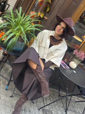 Klasyczny krój spódnicy uszytej z tkaniny koszulowej w brązowym odcieniu.