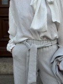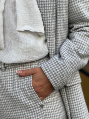 Eleganckie Damskie spodnie uszyte z mięsistej tkaniny we wzór szaro-kremowej pepitki.