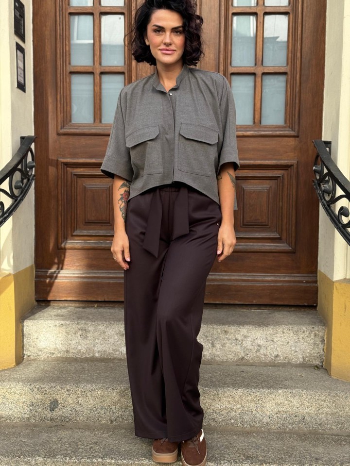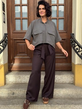Eleganckie Damskie spodnie uszyte z tkaniny ubraniowej w odcieniu ciemnego brązu.