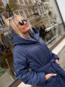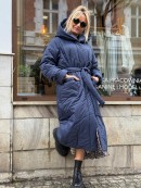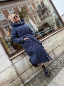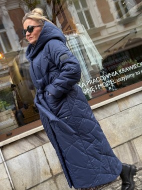 Zimowy płaszcz o oversizowym kroju z pikowanej tkaniny w granatowym kolorze.