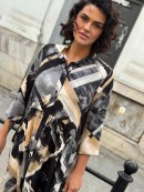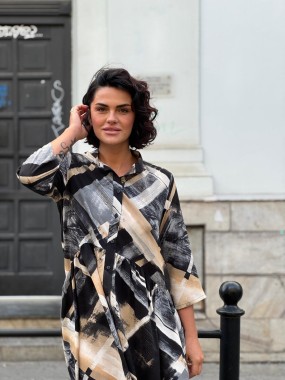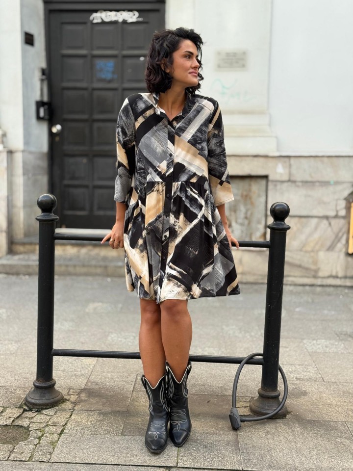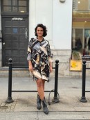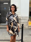 Sukienka Lea, uszyta z włoskiej tkaniny z wiskozy w geometryczny wzór.