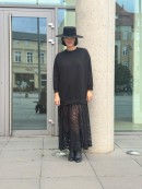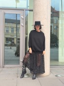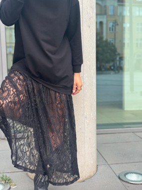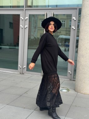 Oversizowa Sukienka Carmen to połączenie sportowej bluzy i eleganckiej koronkowej spódnicy w czarnym kolorze.
