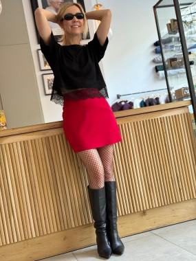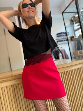 Klasyczny t-shirt uszyty z wiskozy dzianinowej w czarnym kolorze z ozdobną koronką.