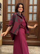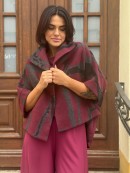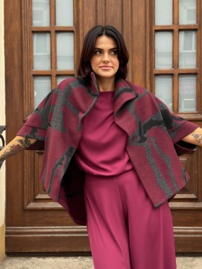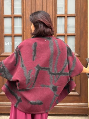 Bardzo efektowne wdzianko we wzór nieregularnych czarnych pasków na bordowym tle.
