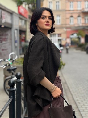 Bardzo efektowne wdzianko uszyte z wełnianej tkaniny w brązowym kolorze .