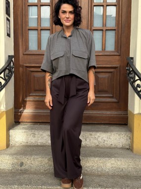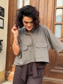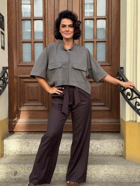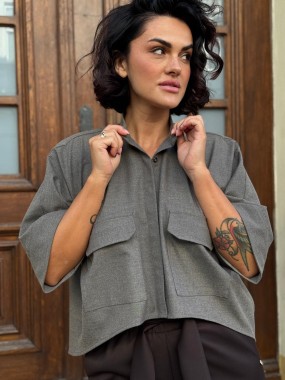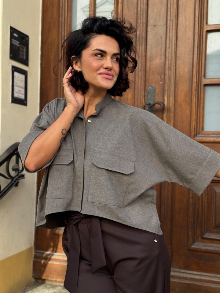 Damskie wdzianko z tkaniny wełnianej w szarym kolorze.